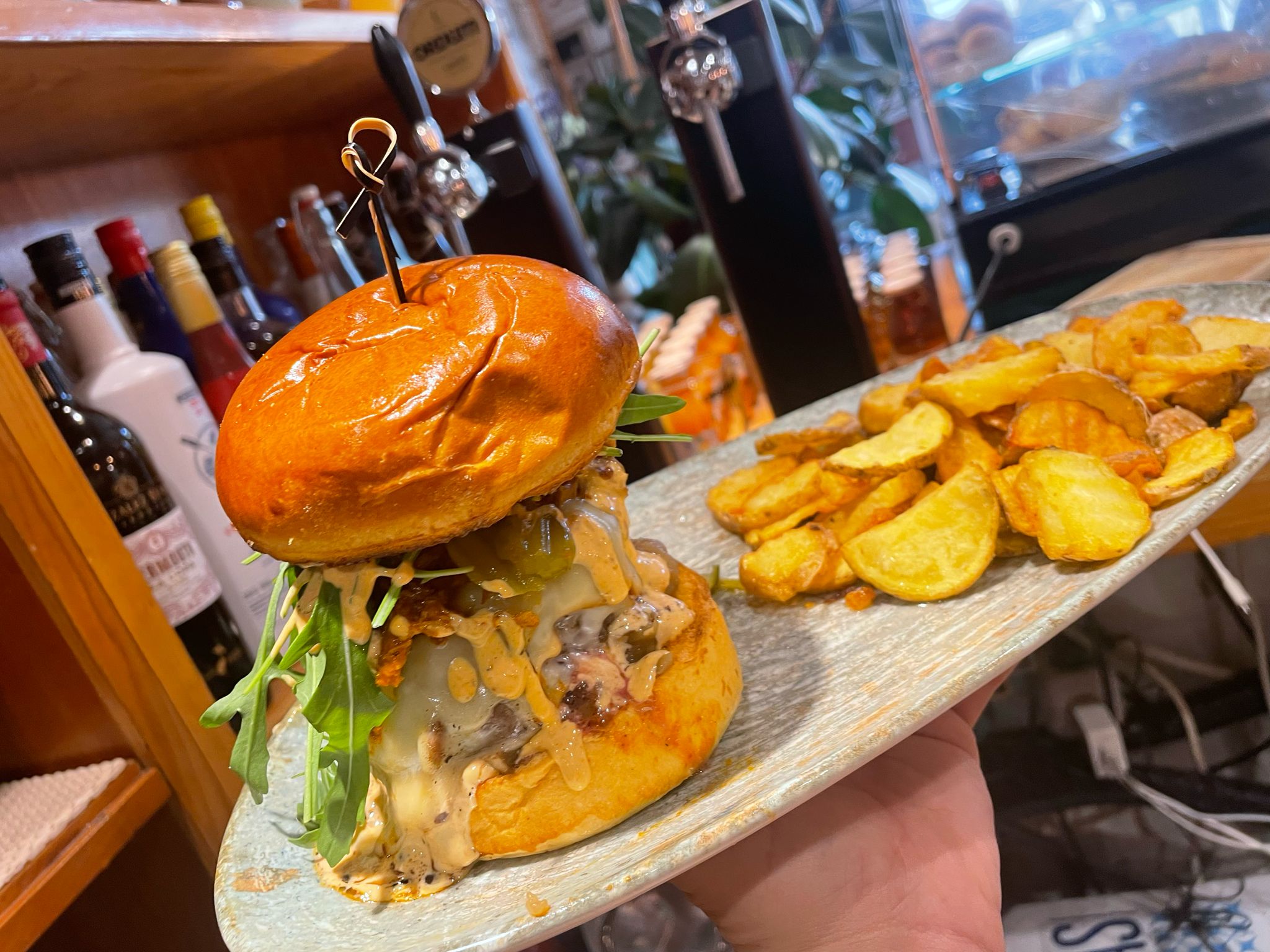 Con carne de buey, nuestra salsa de mango picante y cebolla roja. Todo ello dentro de nuestro pan rústico.