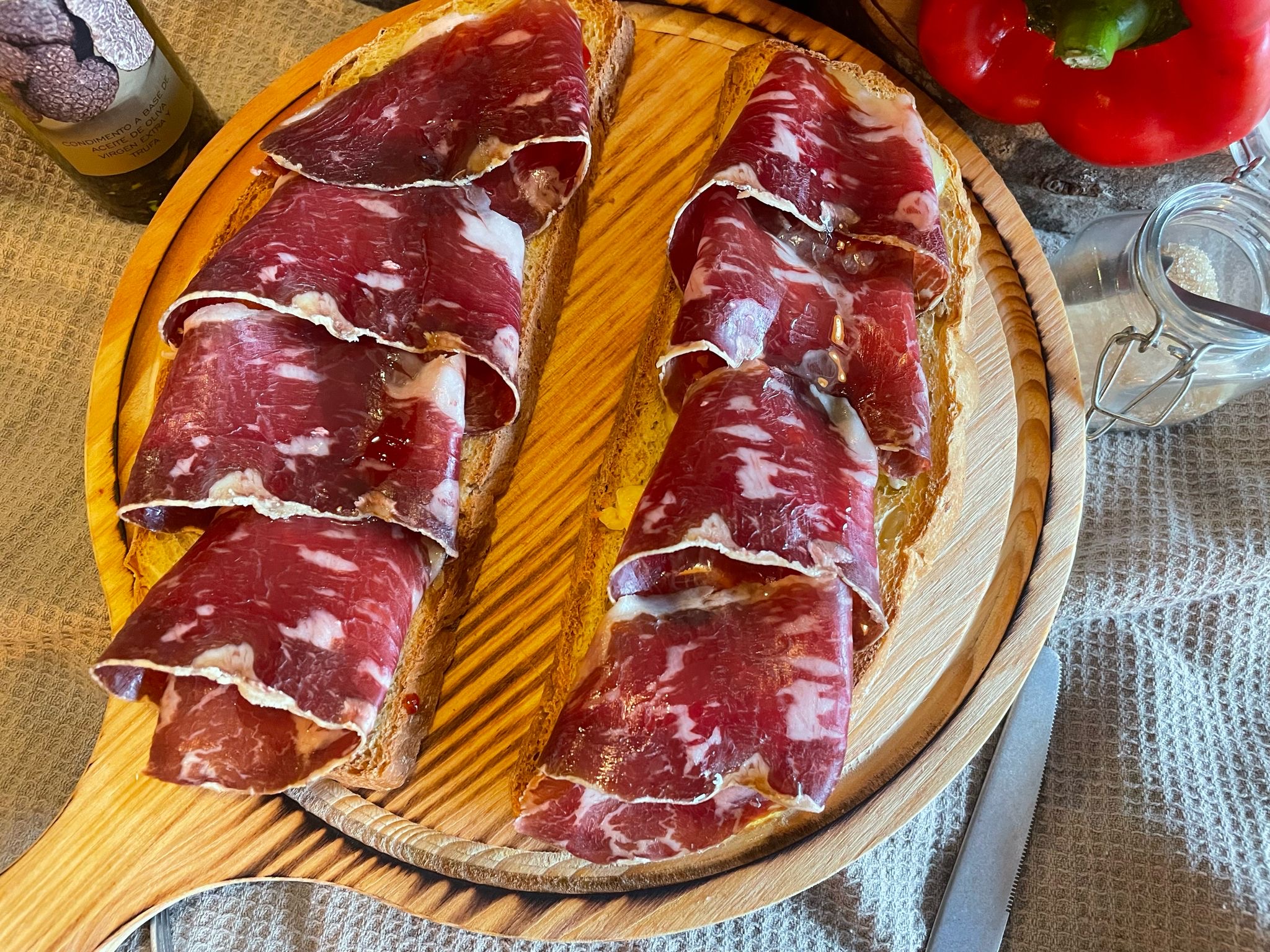 Con Cecina Black Angus, mermelada de pimiento y queso ecológico.